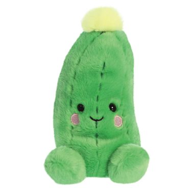 Dillian Cucumber is a bright green cucumber Palm Pal with darker green stitching detail. He has black button eyes, a black smile and rosy, pale pink cheeks. He has a tuft of pale yellow fur on top of his head.