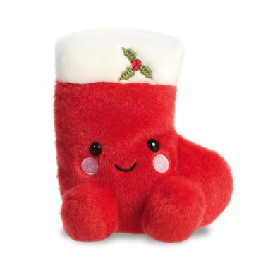 Holly Stocking is a bright red Christmas stocking Palm Pal with a white trim, finished off with embroidered holly leaves and berries. She has black button eyes, a tiny black smile and rosy pink cheeks.